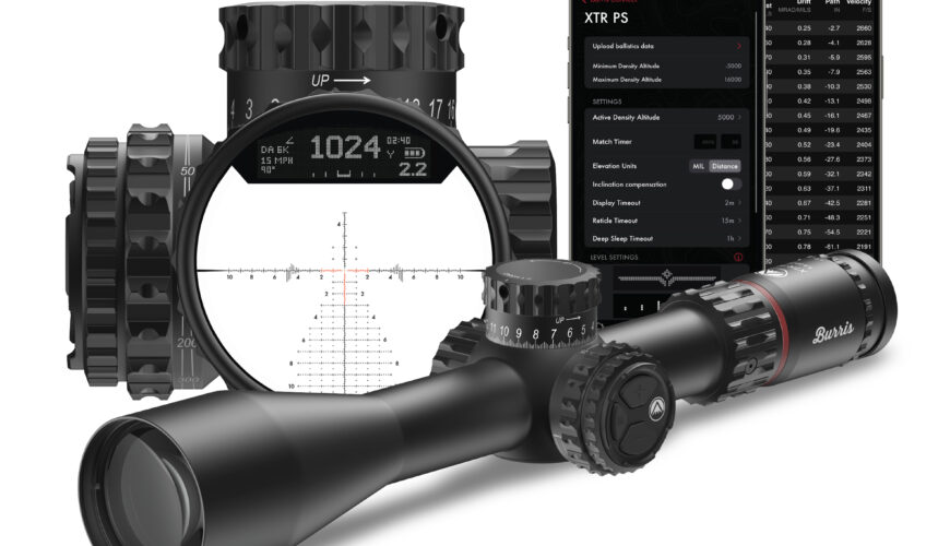 Offered in 3.3-18x50mm and 5.5-30x56mm configurations, the XTR PS includes Burris’ SCR2-MIL illuminated reticle in the first focal plane (available in red or green), ED glass for sharp image clarity, side parallax adjustment, zero-click stop and a rugged, one-piece 34mm aluminum main tube. A soft-touch button array next to the parallax knob controls all digital functions.