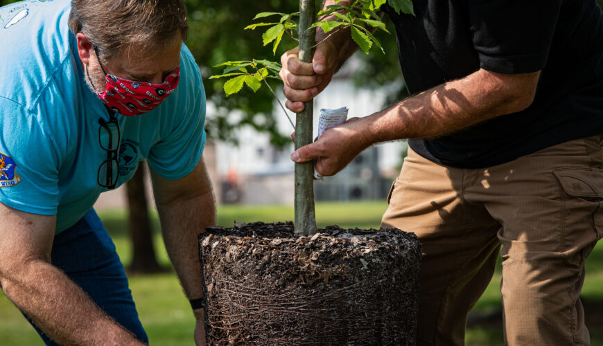 A participant of a tree planting event dumps dirt over the root ball of a swamp chestnut oak tree at Moody Air Force Base, Georgia, April 30, 2021. More than 3,400 communities across the country have achieved Tree City USA status by meeting the core standards for recognition. (U.S. Air Force photo by Senior Airman Hayden Legg)