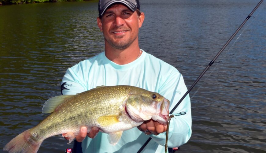 Todd Kersey shows off a largemouth bass he caught on a soft-plastic fluke-type bait while fishing a pond near Miami, Fla. John N. Felsher Photo