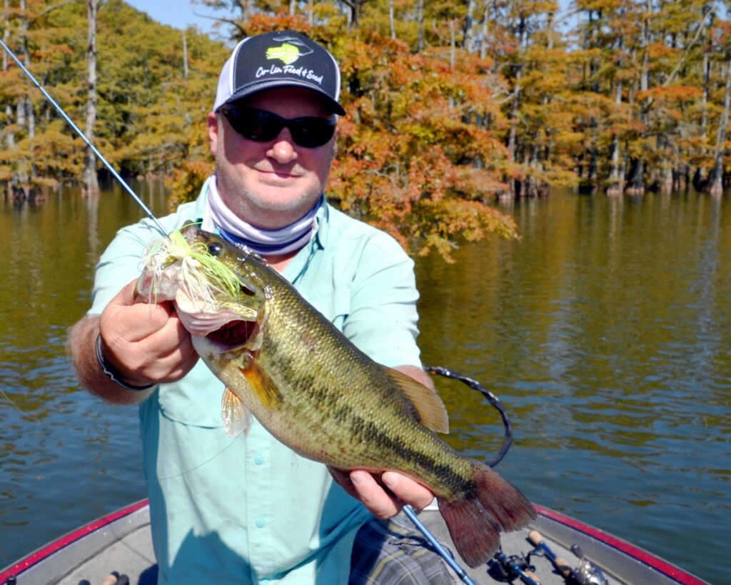 Gene Bishop, a Bassmaster Classic veteran and guide from Madison, Miss., shows off a bass he caught on a spinnerbait while fishing around cypress trees on Lake Washington. John N. Felsher Photo